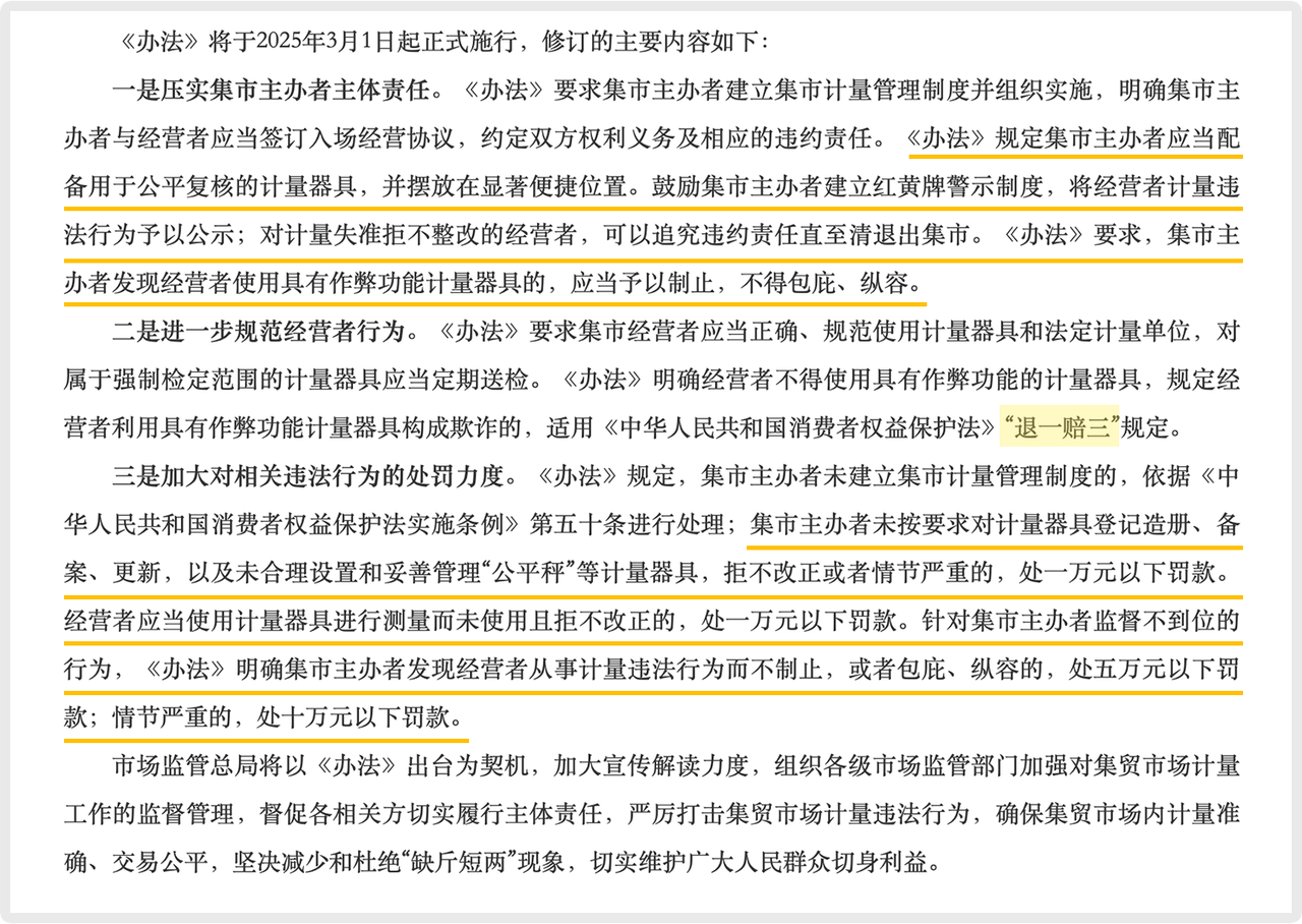○ 2025年3月1日:新版《集貿(mào)市場計(jì)量監(jiān)督管理辦法》施行。其中核心變化之一是全面壓實(shí)了市場主辦方的管理主體責(zé)任。要求其建立計(jì)量管理制度、對場內(nèi)秤具登記備案,并有責(zé)任制止并不得包庇計(jì)量作弊行為,否則將面臨高額罰款。這些規(guī)定從市場管理源頭建立了防線,促使市場主動加強(qiáng)對合規(guī)電子計(jì)價秤的監(jiān)督與采用。