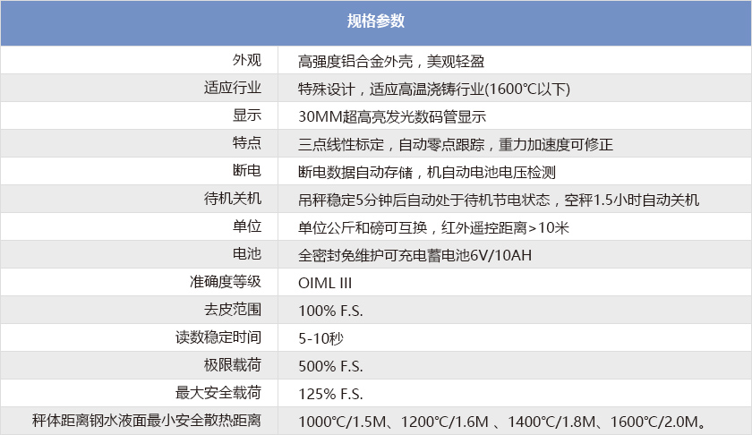 耐高溫電子吊秤,專為冶金、鑄造行業度身設計,適用于高溫環境。它在原有普通秤體的基礎上作了專門的設計與改進。以保證在高溫環境下能獲得較好的準確性。